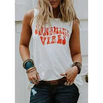 Sunshine Vibes Letter Print Vest T Shirt Women's Summer Sleeveless Graphic Tank Tops Casual Loose Workout Tees (White, X-Large)