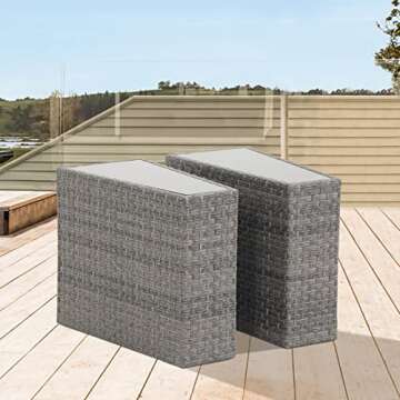 Show moreIntroducing the SUNSITT Rattan PE Resin Wicker Patio Side Table 2-Pack, a perfect blend of style, functionality, and durability for your outdoor entertaining needs. Tailored to complement our grey cushion outdoor half-moon sofa set, these wedge-shaped end tables are designed to create a customized sectional that enhances your outdoor space. With dimensions of 26.2" D x 13.8" W x 21.5" H, they feature a sleek tempered glass table top that is not only elegant but also easy to clean and maintain. Crafted from high-quality resin wicker on a robust powder-coated steel frame, these tables are built to withstand the elements while offering a chic addition to your patio, deck, or garden.