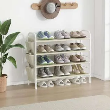 Show moreTransform your entryway or closet with the sleek and sophisticated SUOERNUO Shoe Rack Storage Organizer. This stunning 4-tier shoe shelf is engineered for both functionality and style, ensuring you never have to compromise on your decor while keeping your shoes neatly organized. Crafted from durable metal, this compact shoe organizer not only accommodates your footwear collection efficiently but also boasts an elegant beige finish that melds seamlessly into any room. Its side bag provides added storage for accessories like shoe brushes, keys, or your daily essentials, making it a perfect addition for busy individuals.