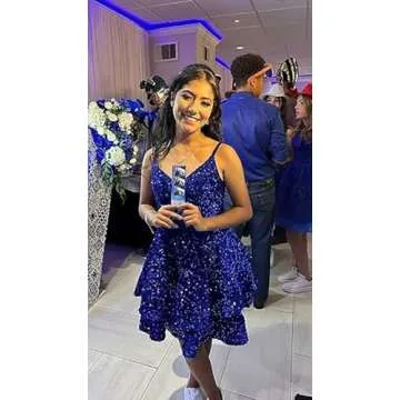 SUOLUOS Women's Tiered Sequin Homecoming Dresses 2024 Sparkly Short Spaghetti Straps V Neck Cocktail Party Gowns Blush Pink US20W