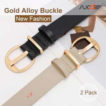 SUOSDEY 2 Pack Fashion Womens Leather Belts Black Beige Ladies Belt with Gold Buckle for Jeans Pants Dresses
