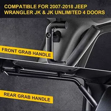 Show more Introducing a must-have accessory for all Jeep enthusiasts – Premium Jeep Grab Bars. Designed for everyday adventurers and off-road warriors alike, these grab bars enhance both functionality and style. Crafted with high-quality steel, they offer unparalleled support for entering and exiting your Jeep, especially for passengers who may struggle with higher lifts. The sleek black finish not only looks great but also resists rust and corrosion, ensuring it withstands the test of time and rough terrains.