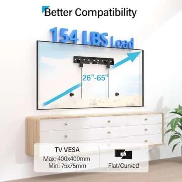 This mount also features a universal design that supports a maximum weight capacity of 154 lbs, having been rigorously tested to hold three times that weight without compromising safety or stability. With maximum VESA compatibility of 400x400mm, it’s equipped to support a wide range of TV brands, making it the perfect addition to your living room, home theater, or bedroom.