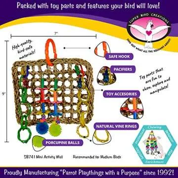 Super Bird Creations SB741 Seagrass Mini Activity Wall with Colorful Foraging Toys for Parrots, Medium Size, 9” x 7” x 2”