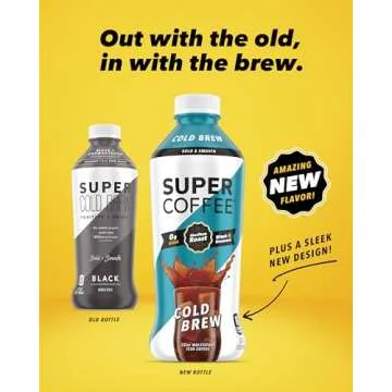 Show more Experience the invigorating multitude of benefits from Super Coffee's Cold Brew Black, a revolutionary bottled coffee that elevates your caffeine intake without the guilt of added sugars. Each of the six 32oz multi-serve bottles is expertly crafted to deliver a robust flavor profile packed with 250mg of caffeine and 1g of protein, making it the perfect addition to your keto coffee regimen. Designed for those who seek a refreshing, smooth coffee experience, this cold brew is expertly brewed to enhance your lifestyle while keeping your carb counts low. The unique formulation ensures you savor a cup of coffee that is rich yet balanced – bold without the bitter notes. Less