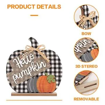 Super Holiday Fall Hello Pumpkin Sign Decorations - Buffalo Plaid Tabletop Decor for Home