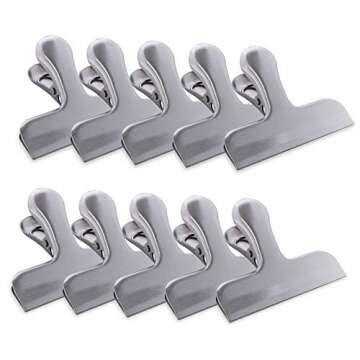 Show moreIntroducing the Super Z Outlet 10 Pack Heavy Duty Metal Silver Chip Bag Clip Clamps – your ultimate solution for keeping your food fresh and your workspace organized! Crafted from durable stainless steel, these robust clips are designed not only for sealing food bags—be it frozen veggies, chips, or fresh produce—but also to enhance the way you display notes, manage papers, and showcase your most creative projects. Each clip measures a generous 3 inches wide, providing a strong grip that ensures nothing slips through the cracks. You’ll love their slim design that allows for effortless storage, making these clips an essential addition to your kitchen and office supplies.