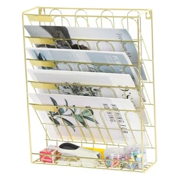 Transform your workspace into a hub of productivity and style with the Superbpag Desk Organizer. This 5 Tier Hanging File Organizer is meticulously crafted from high-quality industrial-strength steel wire mesh with a robust solid steel frame, ensuring you acquire an organizer that is built to last. Its elegant gold finish features a radiant gloss that adds sophistication to your office or home decor. Thoughtfully designed with circular...