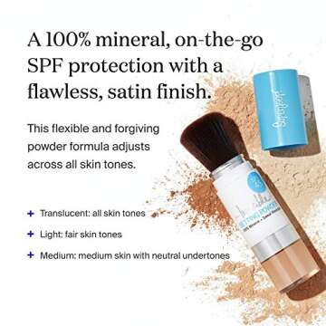 Show moreThe Supergoop! Invincible Setting Powder in Medium is the perfect blend of high-quality mineral makeup and serious sun protection, encapsulated in a sleek, travel-friendly format of 0.15 oz. This remarkable setting powder is not just designed to beautifully set your makeup; it also offers broad-spectrum SPF 45 protection, safeguarding your skin from harmful UV rays throughout the day. Its lightweight formula feels airy on the skin and works wonders in smoothing your skin's appearance while effectively reducing shine. Whether you're heading to work or enjoying a day outdoors, this powder ensures that you look fresh and radiant while keeping your skin safe from sun damage.