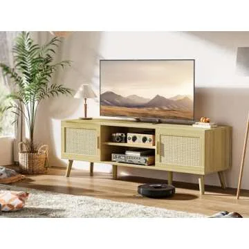 Show more Transform your living space with this exquisite TV stand that effortlessly combines modern and bohemian styles. The eye-catching rattan-decorated doors beautifully complement the natural surface, making it not just a furniture piece but a stunning centerpiece for your bedroom, living room, or entryway. Designed to accommodate TVs ranging up to 65 inches, this versatile media cabinet offers a spacious desktop measuring 53.9'' x 15.7'', ensuring you can display your favorite decor while providing ample support for your electronics.