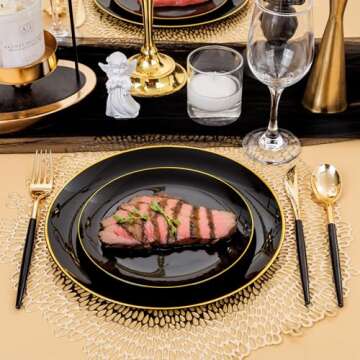 Show moreIntroducing the Supernal 150-piece Black Plastic Plates and Gold Silverware Set, a premier dinnerware solution designed for those who want elegance without the hassle. This complete set includes 30 dinner plates, 30 salad plates, and 30 pieces each of knives, forks, and spoons, all neatly packaged in a sturdy box, making it an ideal gift option. Crafted from 100% food-grade, BPA-free plastic, these plates combine aesthetic appeal with functionality, making any gathering unforgettable while ensuring safety and convenience.