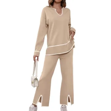 Show more Introducing the **SuperPrity Lounge Sets for Women**, a stylish and versatile two-piece outfit perfect for the modern woman! This fashionable knit set features a super-soft fabric that ensures maximum comfort and is designed to flatter all body types. The unique sweater tops come with long sleeves, a chic notch neck, and a playful side split hem, creating a cozy yet trendy look suitable for all occasions. The wide-leg pants boast a high-waisted and comfy elastic waistband, offering a relaxed fit that you'll love. Available in a range of colors, including a sophisticated khaki, this set is not just for lounging; it's perfect for outings, travel, or simply enjoying a day at home with style.
