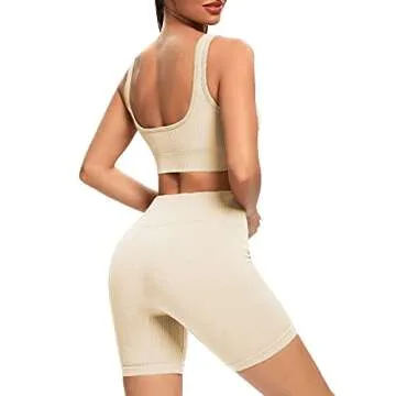 SUPJADE Buscando Yoga Outfits Workout Sets for Women 2 Piece Shorts Seamless High Waist Ribbed Leggings Sets with Sports Bra(A_Kahki, Small)