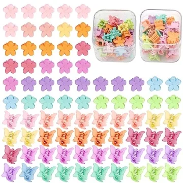 Show more Introducing the SuPoo 80 Pcs Butterfly and Floral Hair Accessories, a vibrant assortment of mini clips designed to elevate your hairstyling experience! This delightful set includes 40 flower claw clips and 40 butterfly hair claw clips, offering a total of 80 pieces in an array of bright colors. Each clip measures between 0.5 to 0.6 inches, making them ideal for both adults and children. Embrace your style with these cute accessories that blend practicality and fun.