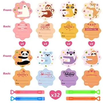 Show more Introducing the perfect way to celebrate love and friendship this Valentine's Day: our exclusive Super Value Pack! This delightful gift set features 32 mini bubble wands in four vibrant colors along with 32 adorable Valentine cards, each showcasing one of eight unique animal-themed designs. Imagine the joy on kids’ faces as they receive these charming gifts, creating cherished memories during classroom celebrations.