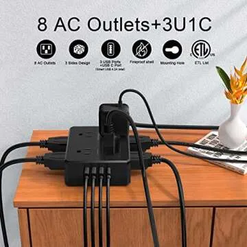 Show moreIntroducing the **Surge Protector Power Strip** - your all-in-one solution for efficient power management! This premium power strip features an innovative **3-side design**, enabling you to organize and connect up to **12 devices simultaneously** without any hassle. With **8 widely spaced AC outlets** and **4 USB ports** (including a high-speed USB-C), our power strip delivers reliable performance tailored for both home and office use. The built-in surge protection safeguards your valuable electronics from voltage spikes, while its sleek design fits perfectly in any corner of your workspace or living area, making it an essential companion for students in dorms, busy professionals, and families alike.