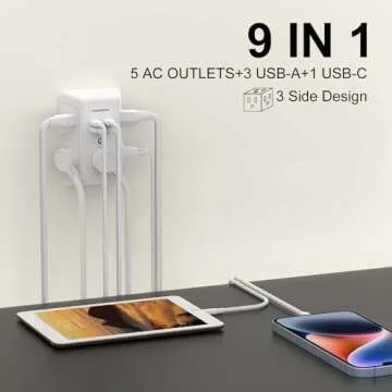 Introducing the Surge Protector with 4 USB Ports—the ultimate solution for all your power needs! This multi outlet extender features a unique 3-side design that provides an astonishing 5 AC outlets and 4 USB charging ports (including 3 USB-A and 1 USB-C), making it perfect for busy homes, offices, or classrooms. With a total output of 4.2 amps, this compact powerhouse measures just 5.5 x 3.8 x 1.7 inches...