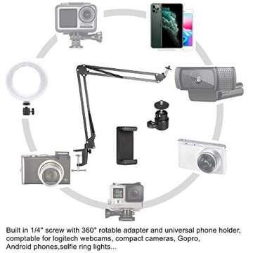 Show more Elevate your video calls, streaming sessions, or photography with this indispensable Suspension Scissor Arm Stand Set. This versatile kit includes 2 suspension boom scissor arms, a 6-inch mobile selfie ring light, and two jaw clamps that can support maximum width of 2 inches, making it flexible for various setups. It provides the perfect balance of functionality and quality, easily accommodating devices up to 2lbs (0.9kg) with its sturdy metal construction. Setting up has never been easier! In just a few minutes, you can attach this universal phone holder to nearly any smartphone, DSLR, or webcam.