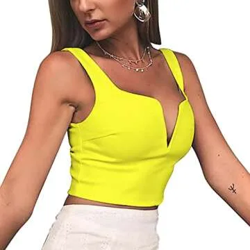 Susupeng Women Sexy Deep V Neck Sleeveless T Shirt Slim Crop Top Side Zip Casual Tank Tops (Small, Fluorescent Yellow)