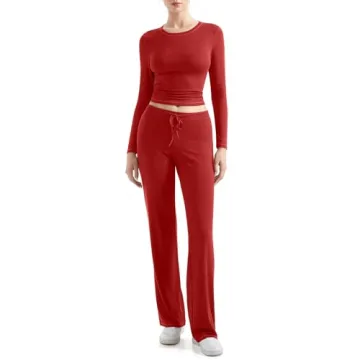 SUUKSESS Women 2 Piece Lounge Matching Sets - Long Sleeve Top & Straight Pants in Red