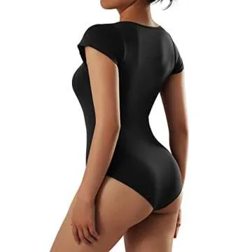 SUUKSESS Women Cap Sleeve Square Neck Bodysuit Seamless Short Sleeve Body Suit Top (Black, S)
