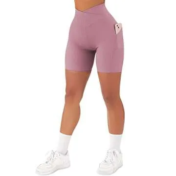 SUUKSESS Women Cross Waist Workout Shorts with Pockets Ribbed High Waisted Booty Biker Shorts (#1 Pink, S)