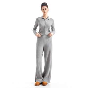 SUUKSESS Women Knit Long Sleeve Lounge Sets Ribbed Button Down Matching Comfy Two Piece Sets (Grey,XL)