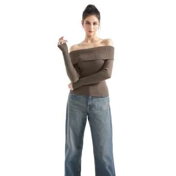 SUUKSESS Women Off Shoulder Sweater Long Sleeve Ribbed Knit Pullover Sweater Tops Going Out Fall Shirt (Khaki, M)