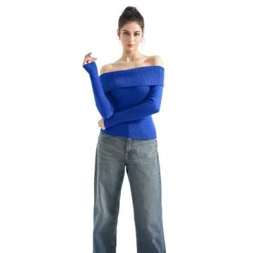 SUUKSESS Women Off Shoulder Sweater Long Sleeve Ribbed Knit Pullover Sweater Tops Going Out Fall Shirt (Sapphire, S)