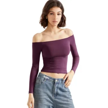 Show more Introducing the SUUKSESS Women Off The Shoulder Double Lined Long Sleeve Shirt, the ultimate combination of style and comfort for the modern woman. This fitted Y2K basic top is designed to elevate your wardrobe with its trendy off-the-shoulder style and flattering silhouette. Crafted from a luxurious blend of 76% Polyamide and 24% Elastane, it features a buttery soft, 4-way stretchy material that glides over your skin while ensuring a perfect fit. Whether headed out for a night on the town or enjoying a casual day with friends, this shirt promises to offer high quality and versatility that complements any outfit. Available in a vibrant plum shade, it is not only an eye-catching statement piece but also pairs effortlessly with jeans or loungewear, making it a must-have for your closet.