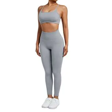 SUUKSESS Women Seamless 2 piece Workout Sets Strappy Padded Sports Bra Booty High Waisted Leggings Outfits (Grey Blue,S)
