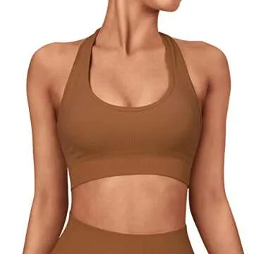 SUUKSESS Women Seamless Halter Sports Bra Open Back Padded Workout Crop Tank Tops (Brown, S)