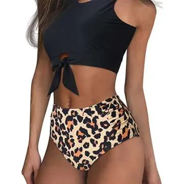 SUUKSESS Women Sexy Halter Tankini Bathing Suits Slimming Tummy Control High Waisted Swimsuits 2 Piece (35 Black Leopard, S)