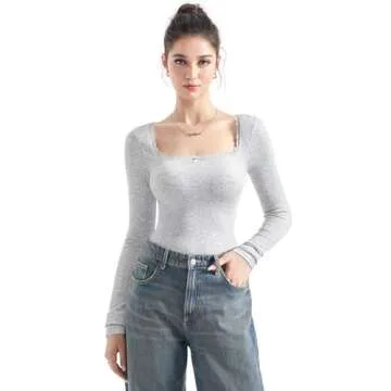 SUUKSESS Women Square Neck Ribbed Long Sleeve Shirts Lace Trim Y2k Crop Top (Grey,M)