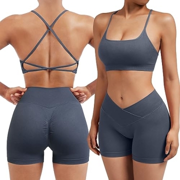 Show more Introducing the SUUKSESS Women V Cross Seamless Workout Sets, a perfect blend of style, comfort, and high performance designed specifically for today’s active women. This striking two-piece workout ensemble includes a trendy strappy padded sports bra and high-waisted booty shorts that move with you to provide unmatched support. The sports bra features a sleek sleeveless design and a unique criss-cross back strap, which not only adds a touch of fashion but also enhances your range of motion while you workout. Say goodbye to uncomfortable sports bras with its removable pads and wider ribbed hem that keeps everything securely in place, allowing you to focus completely on your fitness goals without distractions.