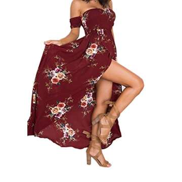 SVALIY Women Floral Off The Shoulder Split Chiffon Maxi Beach Dress Wedding Party (M, Red Wine)