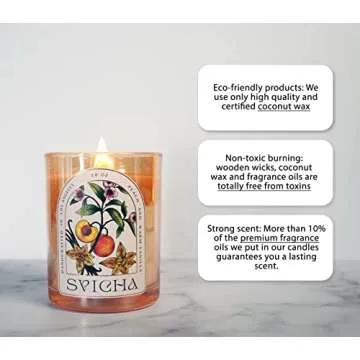 Show more Experience the magic of scent with our exquisite Organic Made Candles from Svicha. Crafted with high-quality premium coconut candle wax, these candles redefine your aromatic experience. Each candle features a unique crackling wooden wick that not only adds a mesmerizing sound but also ensures an eco-friendly burn. The ideal blend of fragrance oils creates a delightful atmosphere, reminiscent of a spring peach garden or a cozy morning at a coffee shop.