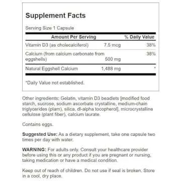 Show moreDiscover the natural power of Swanson Eggshell Calcium with Vitamin D-3, a premium dietary supplement designed to help you maintain optimal bone health and density. Each capsule is formulated with high-quality eggshell calcium, which is known for its superior bioavailability, ensuring that your body absorbs the calcium effectively. Infused with Vitamin D-3, this supplement not only promotes strong bones but also supports healthy teeth. Ideal for individuals seeking to boost their calcium intake, especially those who may not consume enough from their diet.