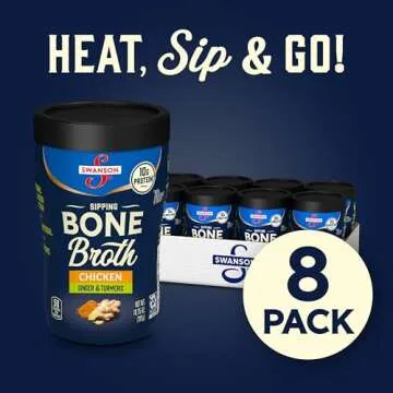 Show moreIndulge in the wholesome goodness of Swanson Chicken Bone Broth with Ginger & Turmeric, a nutritious snack that not only satisfies your cravings but also nourishes your body. Made from real chicken bones, vegetables, and an exquisite blend of spices, this sipping broth is packed with natural collagen protein to support your overall health. Each cup is meticulously crafted with non-GMO ingredients and contains no preservatives, making it a guilt-free treat you can enjoy anytime.