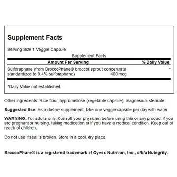 Show moreDiscover the excellent health benefits of Swanson's Sulforaphane, a premium supplement specially crafted from pure broccoli sprout extract. This powerful formula is scientifically designed to provide natural liver support, enhance cellular health, and improve your GI tract function. With each 400 mcg capsule, enjoy a potent combination of nutrients that work harmoniously to combat oxidative stress while promoting overall well-being. Enjoy the convenience of well-researched nutritional support in a small, easy-to-swallow veggie capsule that fits effortlessly into any lifestyle.