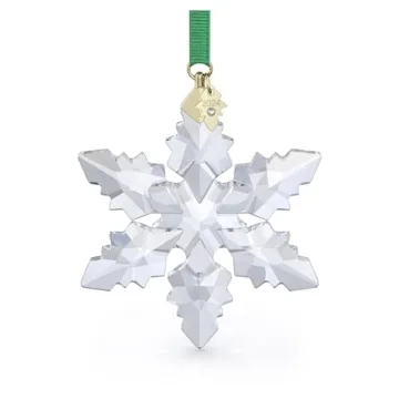 Crafted to accentuate the joy of the holiday season, this ornament is suspended beautifully from a green rayon ribbon, symbolizing peace and joy. It showcases a gold-tone metal snowflake tag, engraved with the year, which adds a personal touch to your festive decorations. The delicate embellishment of a small chaton demonstrates Swarovski's commitment to quality and elegance, transforming your tree into a sparkling masterpiece.