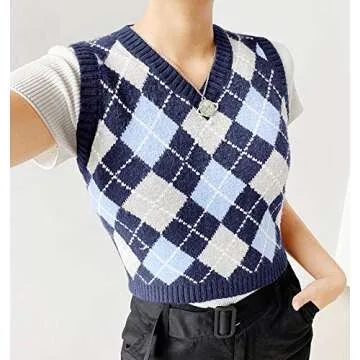 Chic Argyle Plaid Cropped Sweater Vest - Stylish Tank Top for Women Blue Small