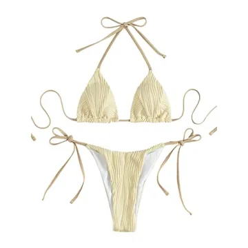 Show moreIntroducing the SweatyRocks Women's 2 Piece Halter Top Swimsuit, a must-have addition to your swimwear collection! Crafted from high-quality polyester, this bikini set features a textured finish and a stylish ribbed design that exudes sophistication and charm. The triangle bikini top is enhanced with a tie neck for a flattering fit that adapts to your unique body shape, while the wire-free design and removable padding ensure you experience ultimate comfort and ease while wearing it. Complete with tie side panties and a high-stretch fabric, this swimsuit ensures you feel confident and at ease whether you’re at the beach or relaxing poolside.