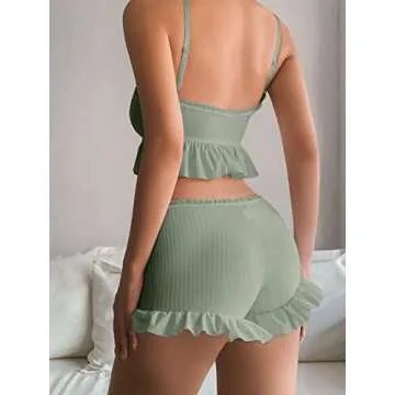 SweatyRocks Women's 2 Piece Lingerie Set Ruffle Trim Tie Front Cami Top and Shorts Sleepwear Mint Green S