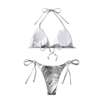 SweatyRocks Women's 2 Piece Metallic Bathing Suit Halter Triangle Bikini Tie Side Swimsuit Silver L