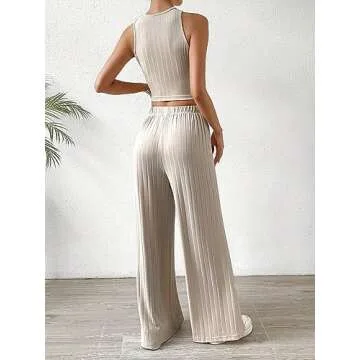 SweatyRocks Women's 2 Piece Outfits Ribbed Knit Sleeveless Round Neck Crop Tank Top and Wide Leg Pants