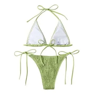 Show moreStep into elegance and comfort with the SweatyRocks Women's 2 Piece Triangle Bathing Suit. Crafted from a luxurious blend of nylon and spandex, this bathing suit promises a soft and breathable experience while you bask in the sun. The chic halter neck design draws attention to your shoulders, and the tie side feature allows you to adjust for the perfect fit. With its smocked styling and micro bra support, this swimsuit perfectly accentuates your elegant figure, while the trendy triangle shape ensures you look stunning whether you're lounging by the pool or enjoying a day at the beach.