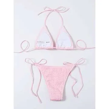 Show more Discover the ultimate in fashionable swimwear with this stunning two-piece bikini set crafted from a luxurious blend of nylon and spandex. Designed for comfort, it wraps your body softly, providing a flattering fit that will make you feel confident and beautiful. The set features a halter neck and tie side design, allowing for adjustable sizing to suit different body types. The smocked detailing adds a touch of texture, while the triangle cups enhance your natural shape, making it perfect for those who want to show off their elegant figure during warm-weather escapades.