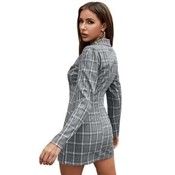 SweatyRocks Women's Casual Puff Sleeve Lapel Button Front Plaid Blazer Dress Grey L