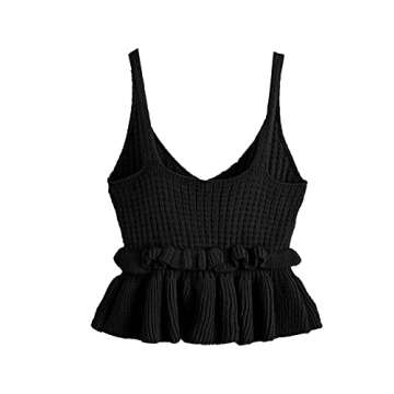 Show moreIntroducing the SweatyRocks Women's Casual Spaghetti Strap Ruffle Hem Peplum Cropped Knit Sweater in classic black, a delightful piece designed for the modern woman who values both style and comfort. Made from 100% acrylic, this fabric not only offers a cozy feel but also features a slight stretch, allowing for ease of movement and a flattering fit. The sleeveless design and ribbed knit texture contribute to its chic appeal, while the ruffle hem adds a playful touch, perfect for sprucing up any outfit. Its versatile v-neckline and cropped length make it an excellent choice for layering or wearing solo—ideal for any occasion.